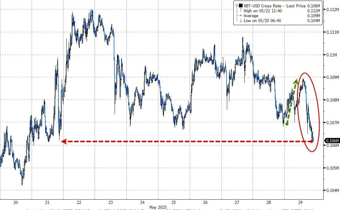 The dollar softened, gold flirted with $3,350 but didn’t quite get there, and Bitcoin stumbled after an early surge, sliding toward $106K despite continued ETF inflows.