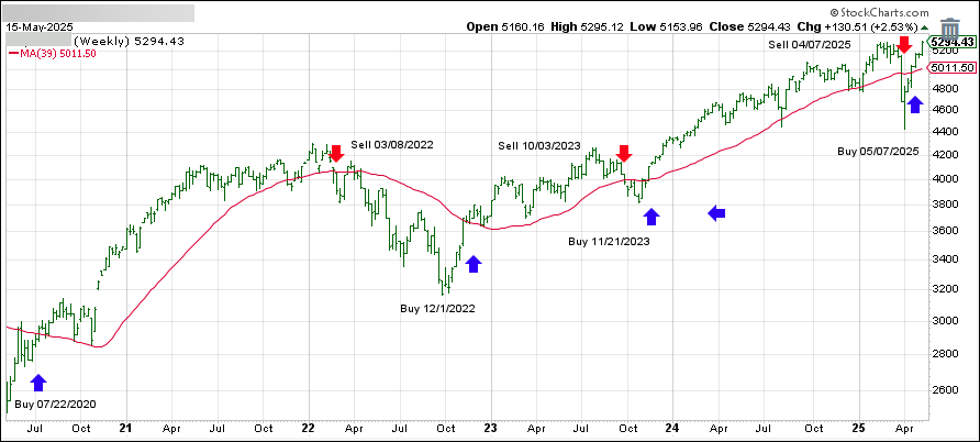 This is our global guide, the International Trend Tracking Index (green). It has broken above its long-term trend line (red) by +5.92% and is now in “Buy” mode as of 5/7/25.
