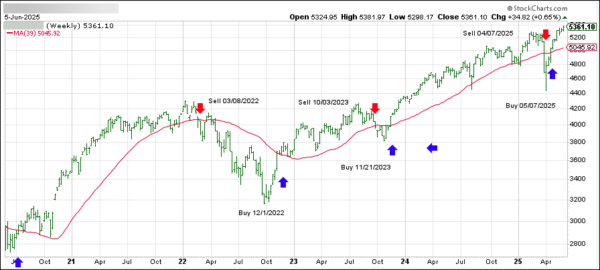 This is our global guide, the International Trend Tracking Index (green). It has broken above its long-term trend line (red) by +6.55% and has been in “Buy” mode since 5/7/2025.