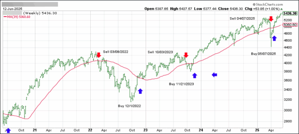 This is our global guide, the International Trend Tracking Index (green). It has broken above its long-term trend line (red) by +7.72% and has been in “Buy” mode since 5/7/2025.