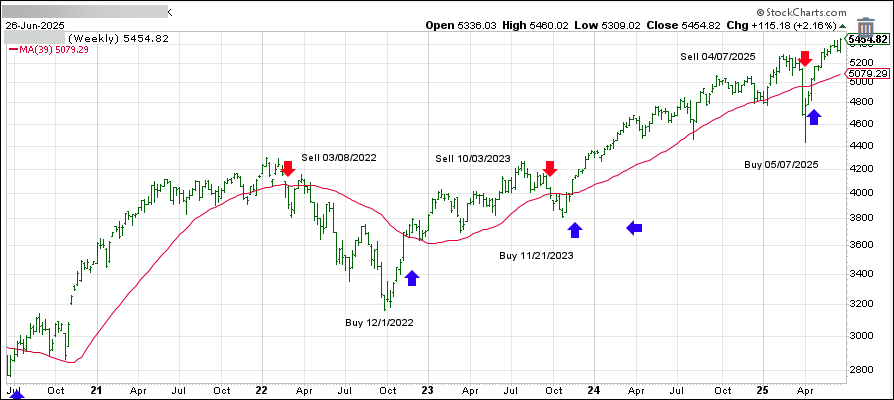 This is our global guide, the International Trend Tracking Index (green). It has broken above its long-term trend line (red) by +7.61% and has been in “Buy” mode since 5/7/2025.