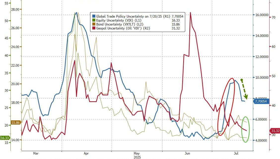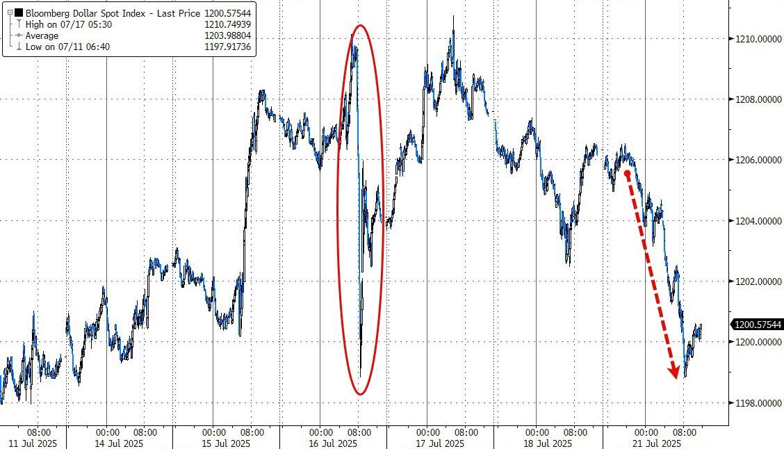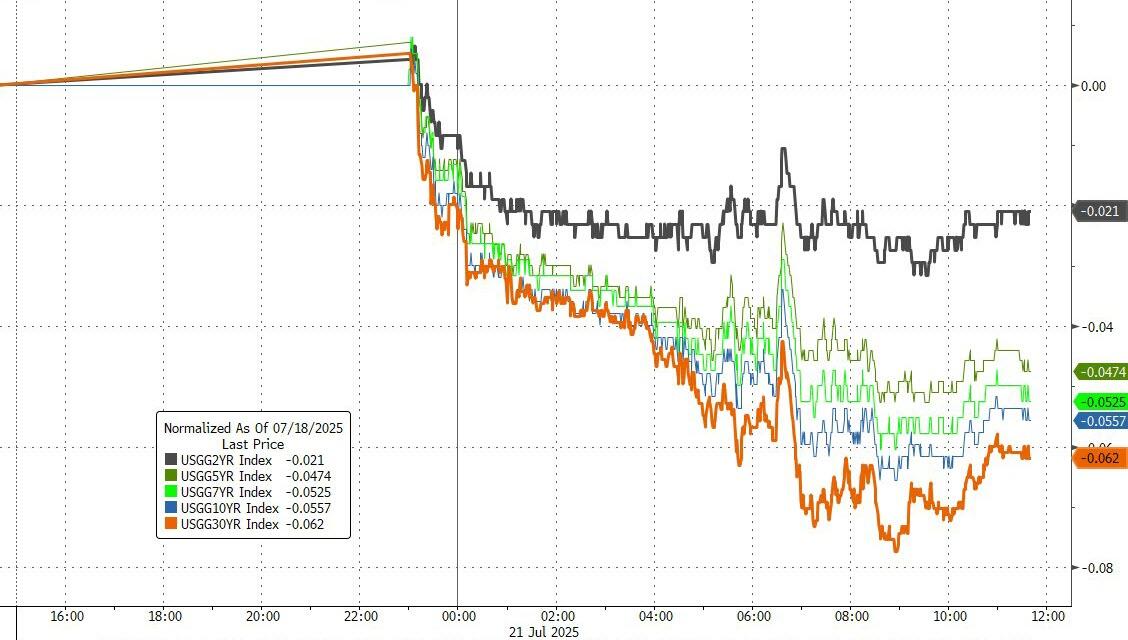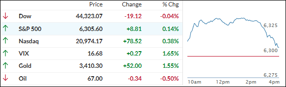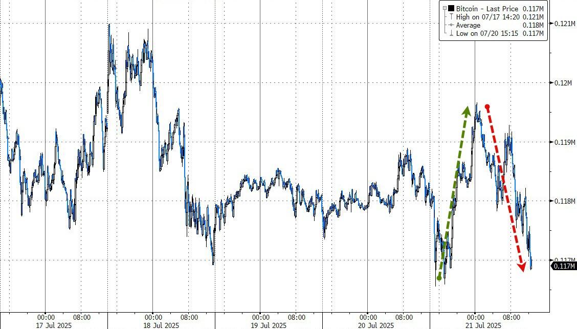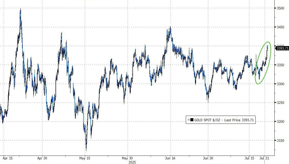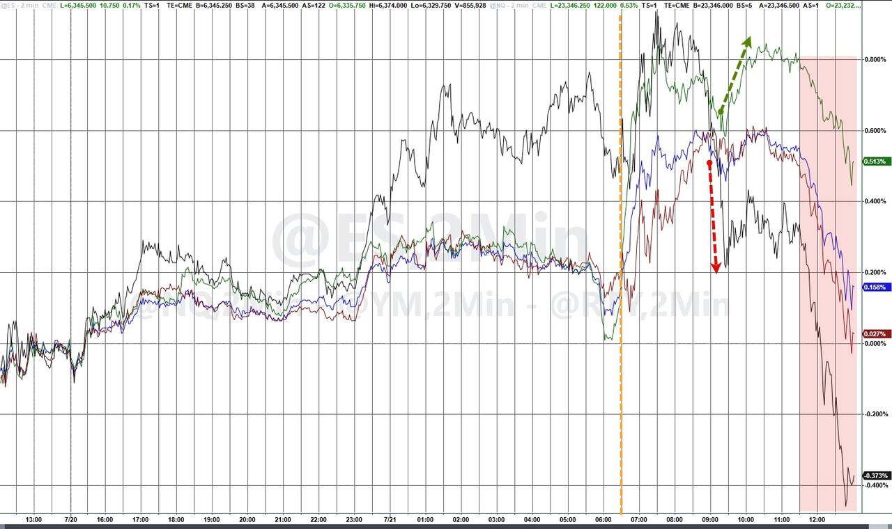 It was a busy day elsewhere too: bond yields fell across the board, the dollar slipped back to last week’s lows (helping gold jump above $3,400 with a 1.54% daily gain), and Bitcoin did the pump-and-dump routine, ending up about where it started.