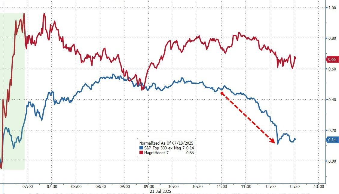 An afternoon bout of selling took the wind out of the indexes’ sails, wiping away the morning gains and leaving the Dow in the red. But the Mag 7 basket once again outperformed the rest of the S&P names, keeping a bit of spark alive.