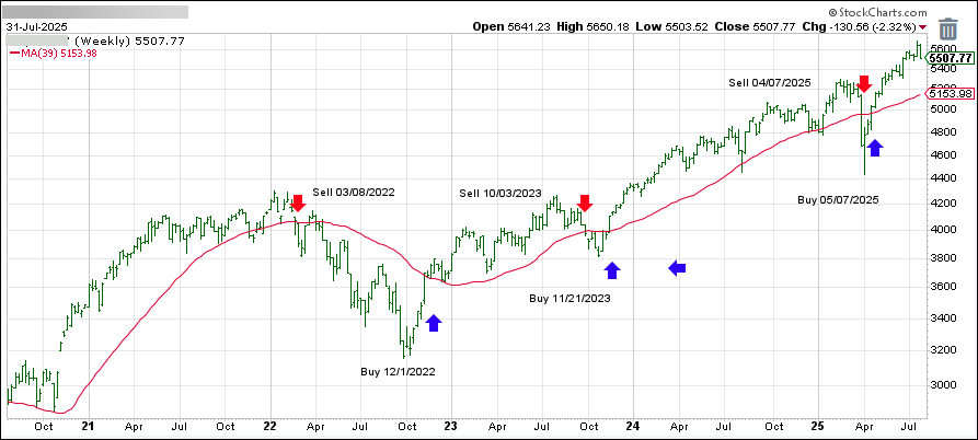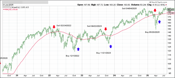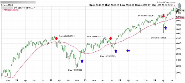 This is our global guide, the International Trend Tracking Index (green). It has broken above its long-term trend line (red) by +7.18% and has been in “Buy” mode since 5/7/2025.
