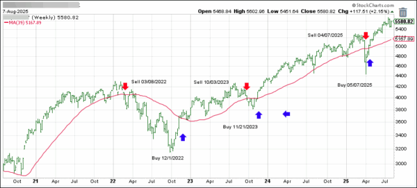 This is our global guide, the International Trend Tracking Index (green). It has broken above its long-term trend line (red) by +8.32% and has been in “Buy” mode since 5/7/2025.