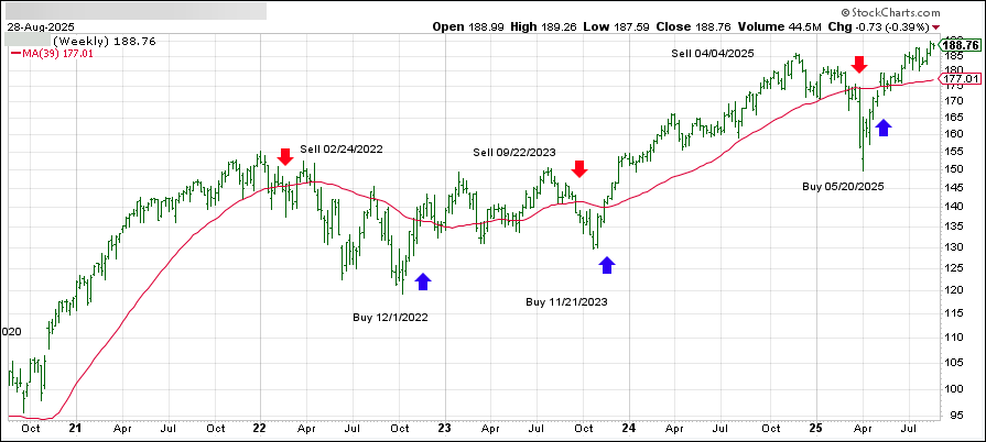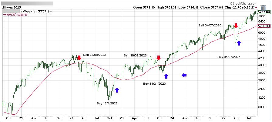 This is our global guide, the International Trend Tracking Index (green). It has broken above its long-term trend line (red) by +10.53% and has been in “Buy” mode since 5/7/2025.