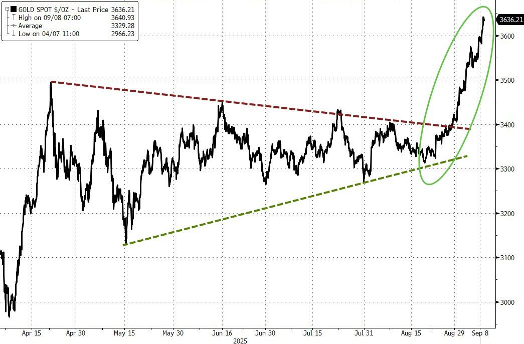 Gold’s bull run hasn’t missed a beat, conquering $3,600 for a fresh record, while the dollar softened, and bitcoin raced back up toward Friday’s highs as bond yields drifted lower.