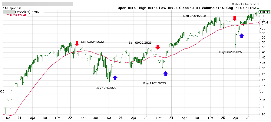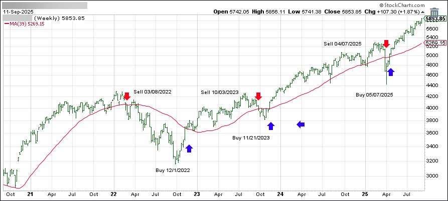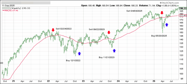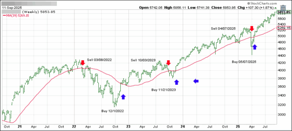 This is our global guide, the International Trend Tracking Index (green). It has broken above its long-term trend line (red) by +11.57% and has been in “Buy” mode since 5/7/2025.
