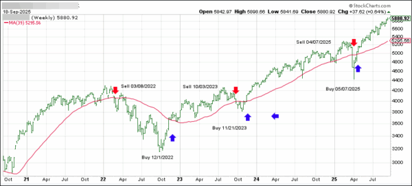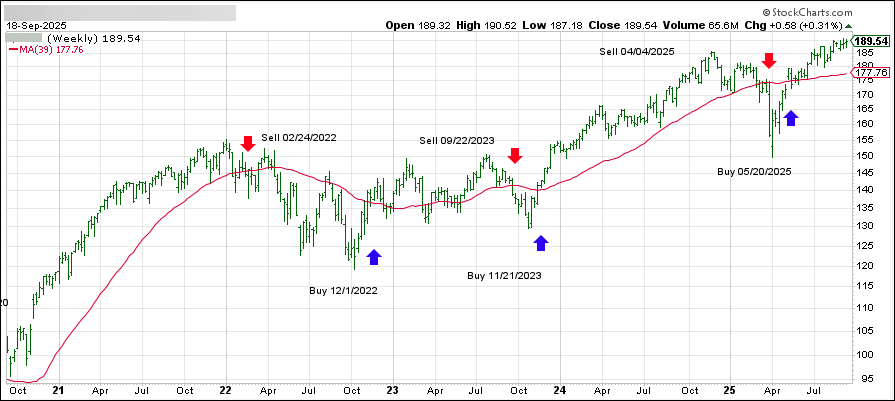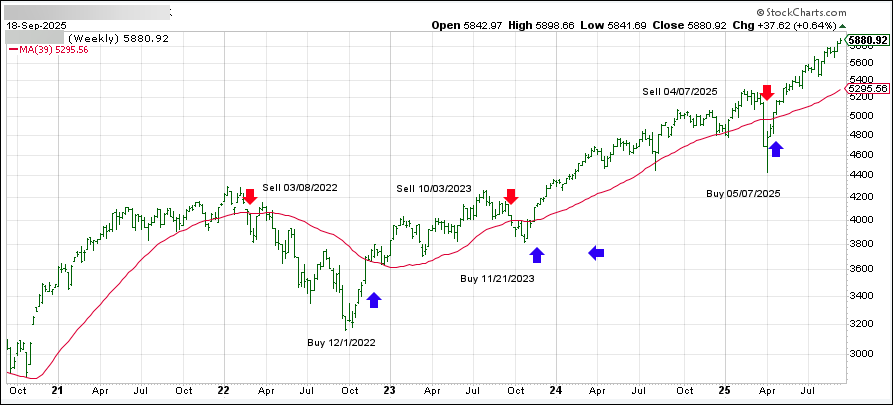 This is our global guide, the International Trend Tracking Index (green). It has broken above its long-term trend line (red) by +11.63% and has been in “Buy” mode since 5/7/2025.