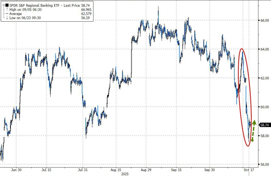 Zions Bancorp, which plunged 13% yesterday after disclosing a $50 million loan charge-off tied to alleged fraud, gained about 2% today after receiving an upgrade. Western Alliance, down 11% on Thursday after revealing similar loan issues, also clawed back some early losses.