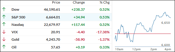 Stocks started the day on uneven footing but quickly found their stride, climbing steadily through the session and ending both the day and the week with solid gains.