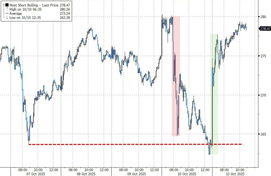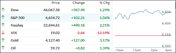 Nearly 80% of S&P 500 stocks traded higher, sparking a broad rebound across sectors. Small caps roared back too, with the Russell 2000 surging over 3% after last week’s bruising decline, helped along by what traders called a massive short squeeze.