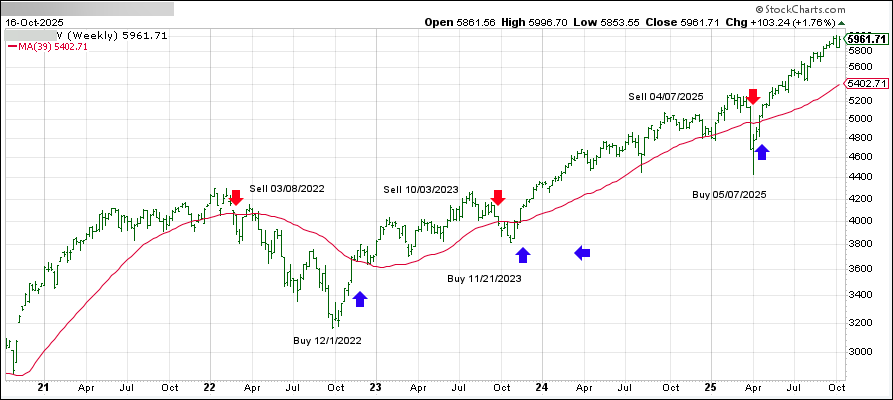 This is our global guide, the International Trend Tracking Index (green). It has broken above its long-term trend line (red) by +10.87% and has been in “Buy” mode since 5/7/2025.