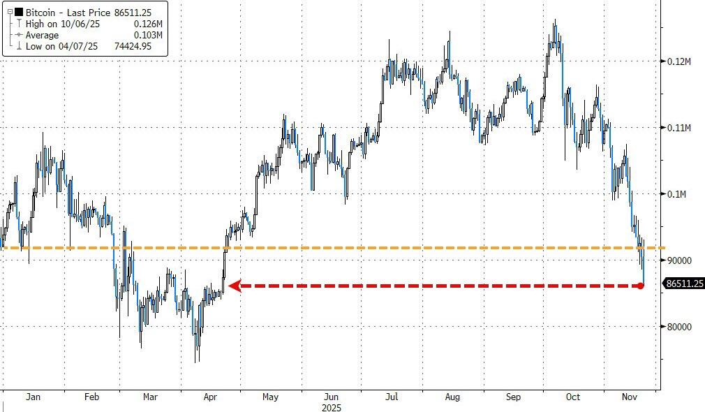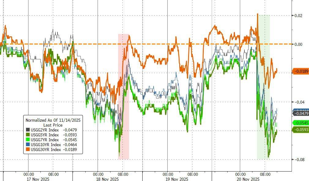 Bonds caught a safe-haven bid (yields dipped), bitcoin got crushed below $90K (lowest since April), and the dollar crept higher.