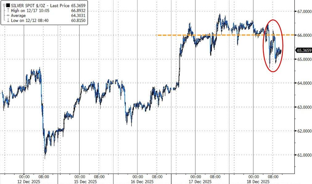 Bond yields eased back, the dollar did a pump-and-dump but ended flat, while the shiny stuff took a breather: gold chopped around and closed basically unchanged, silver gave up its $66 level and pulled back from recent highs.