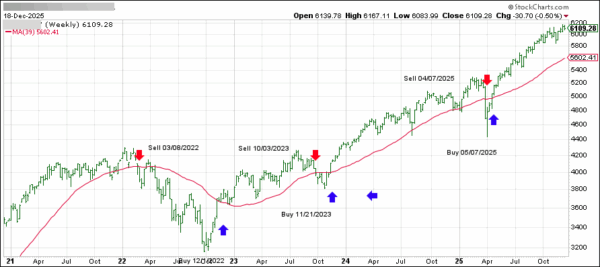 This is our global guide, the International Trend Tracking Index (green). It has broken above its long-term trend line (red) by +9.50% and has been in “Buy” mode since 5/7/2025.