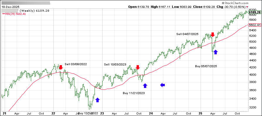This is our global guide, the International Trend Tracking Index (green). It has broken above its long-term trend line (red) by +9.50% and has been in “Buy” mode since 5/7/2025.