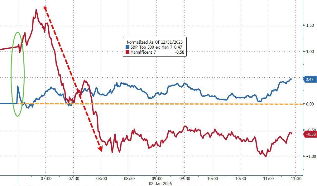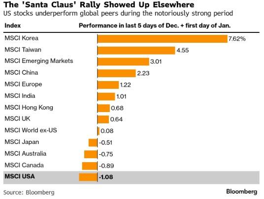 All told, the classic “Santa Claus rally” (last five days of the year + first two of the new) didn’t really show up this time—U.S. stocks lagged global peers during what’s usually a strong stretch.