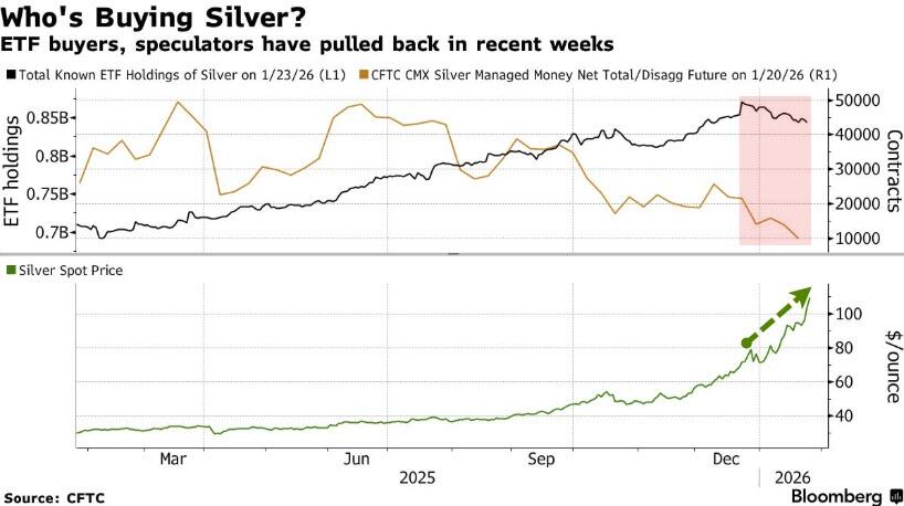Silver’s +65% month-to-date run to fresh records stands in stark contrast to heavy ETF and speculator selling—Bloomberg’s question is spot-on: who’s actually buying this latest leg higher, and how sustainable is it?