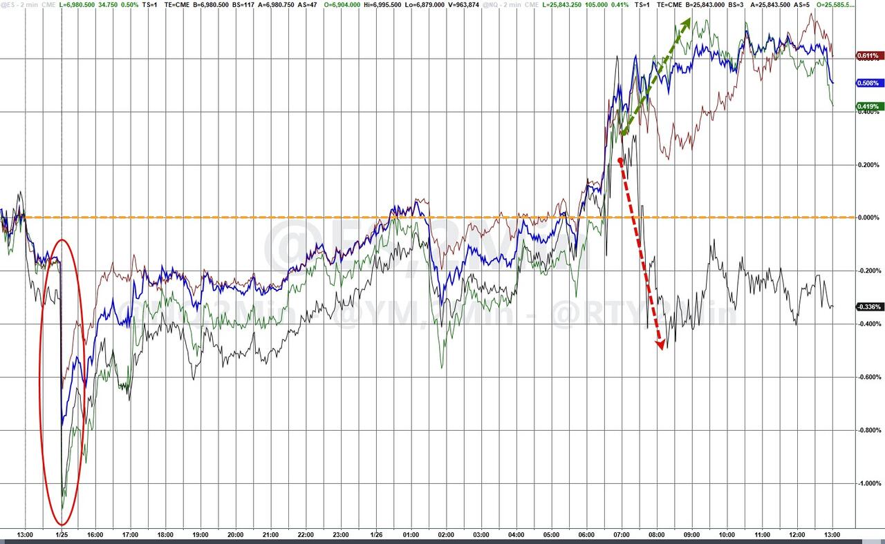 By the close, bond yields pulled back, the dollar broke down to its lowest since March 2022, and equities stayed in rally mode—except small caps, which lagged.