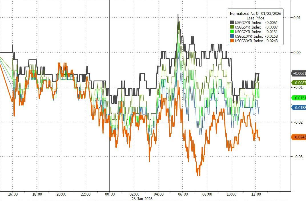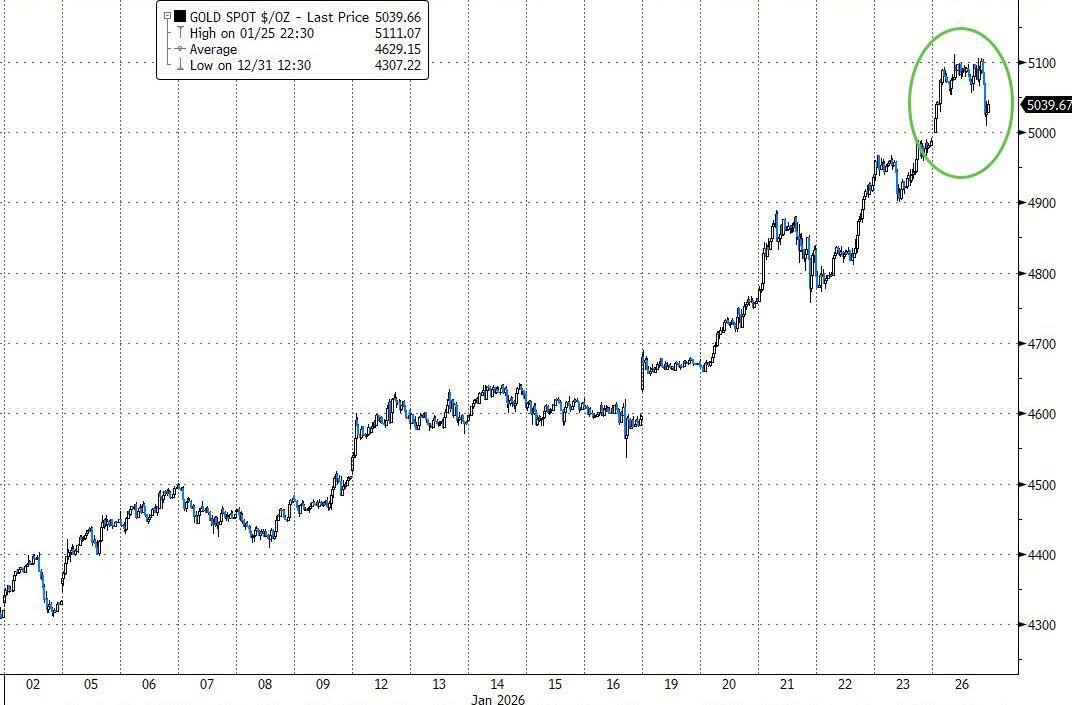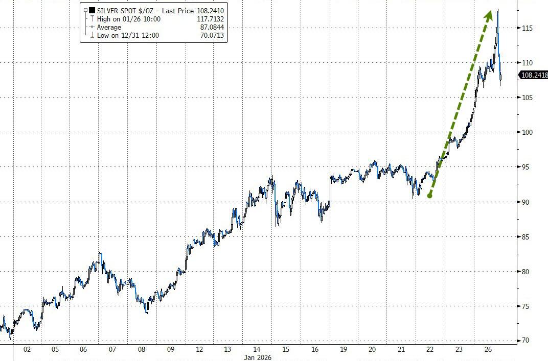 Precious metals once again. Silver exploded as high as $117 (+12% intraday) before pulling back to $107, while gold blasted past $5,000 and closed above it (up ~1.4% after the fade), giving our portfolios a nice boost.