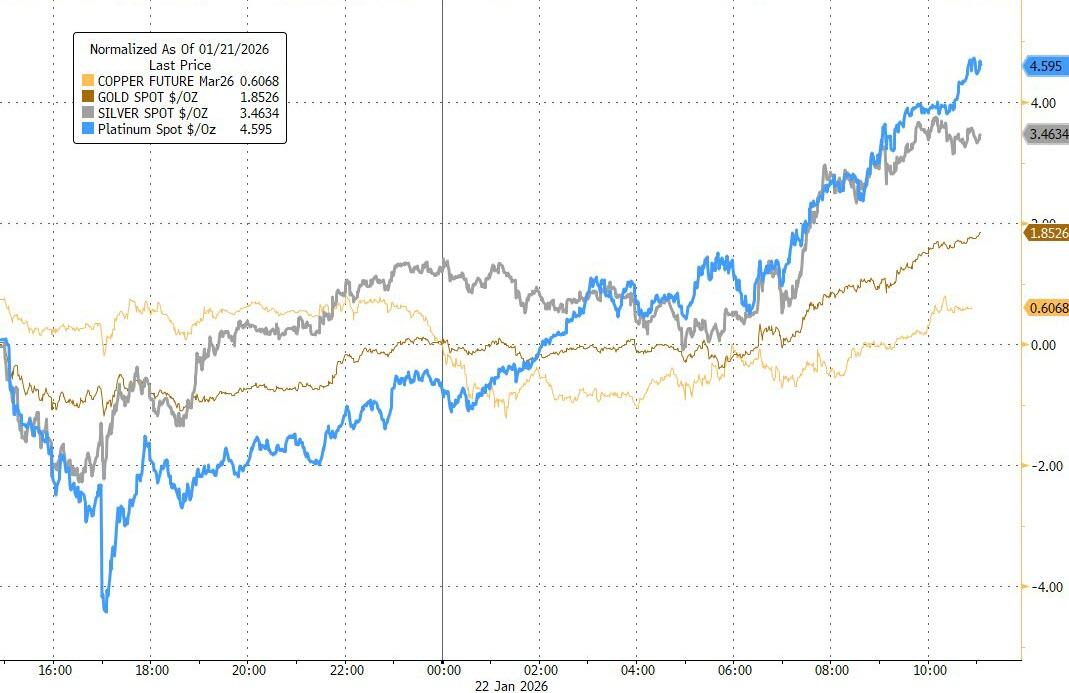 Silver and platinum stole the show even more—silver jumped 3.5%—as commodities keep breaking out to the upside.