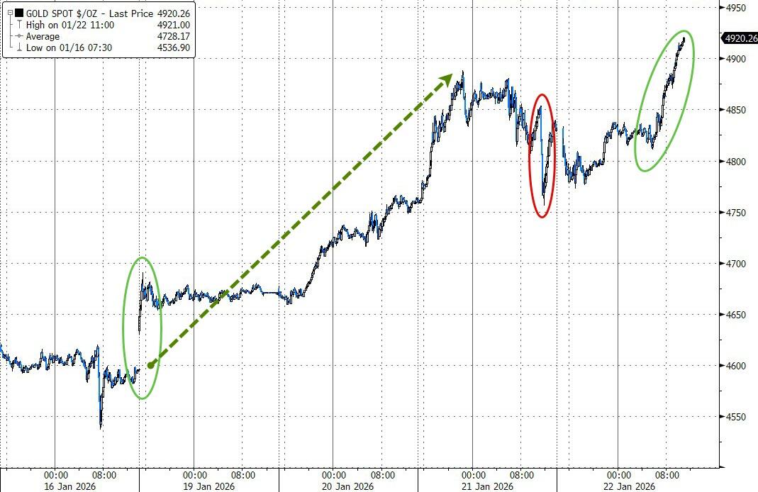Gold dipped early but powered higher to top $4,900 for the first time, closing just a whisker away from $5,000.