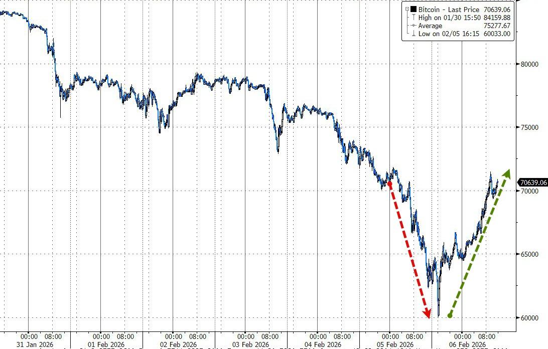 Bitcoin staged a monster rebound, climbing 11% to get back above $70,000 after briefly tanking below $61,000 overnight (more than 52% off its October 2025 record of $126,000).