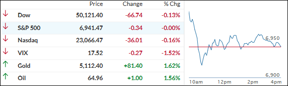 The major indexes spent the rest of the session just drifting around the flat line—up a little, down a little, back, and forth. In the end, it was classic treading water: no big moves, no clear direction.
