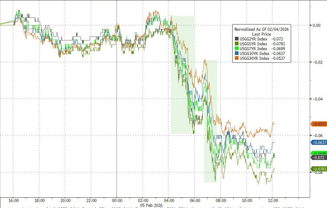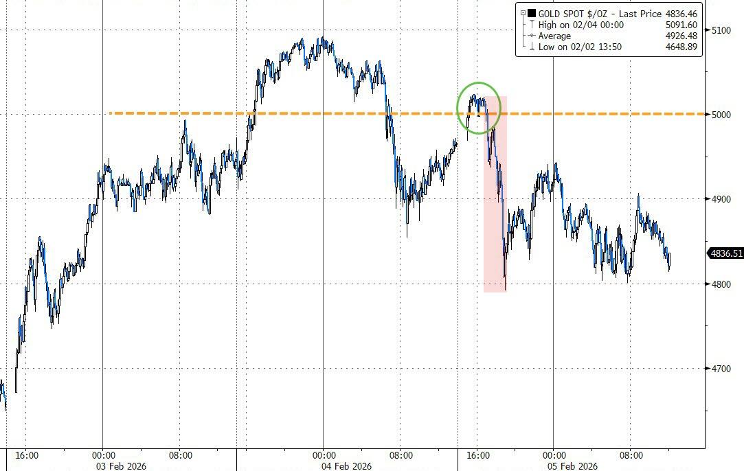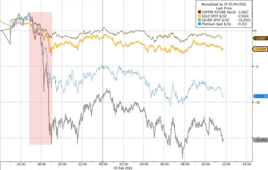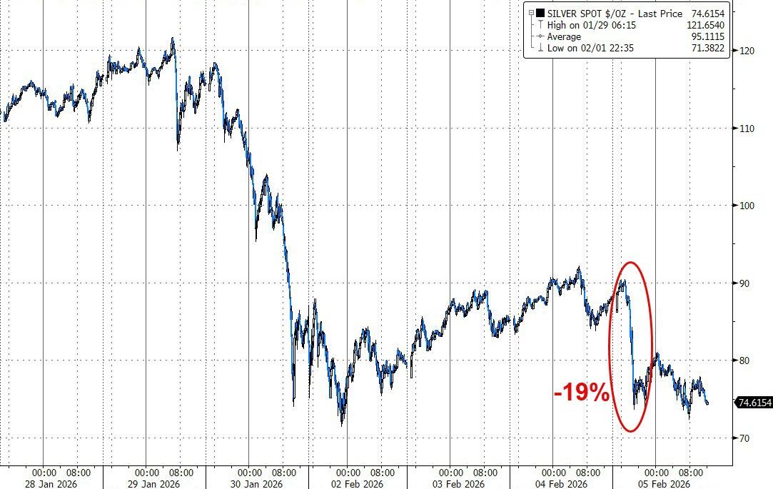 Silver crashed as much as 19% overnight (after liquidation in Shanghai flowed into U.S. markets), while gold briefly touched $5,000 before losing it.