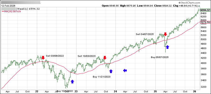 This is our global guide, the International Trend Tracking Index (green). It has broken above its long-term trend line (red) by +12.79% and has been in “Buy” mode since 5/7/2025.