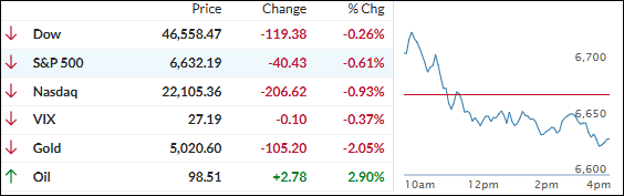 Crude dumped and then ripped right back, and equities moved in reverse—after a positive open, the major indexes slid steadily and finished in the red, with the Nasdaq taking the biggest hit.