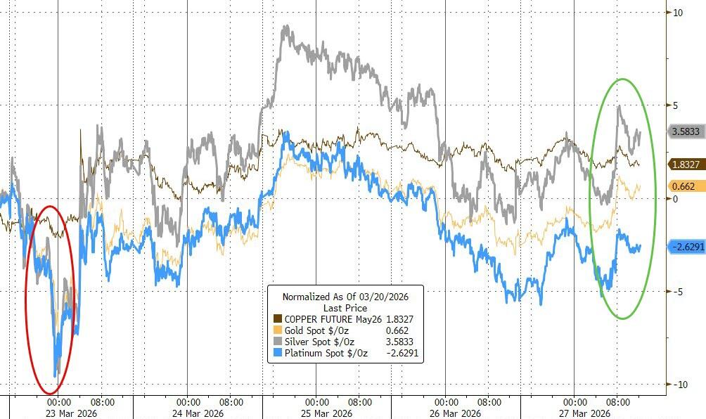 Silver and copper outperformed gold for the week, while Bitcoin retreated below $66K but remains roughly unchanged since the war began.