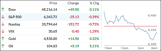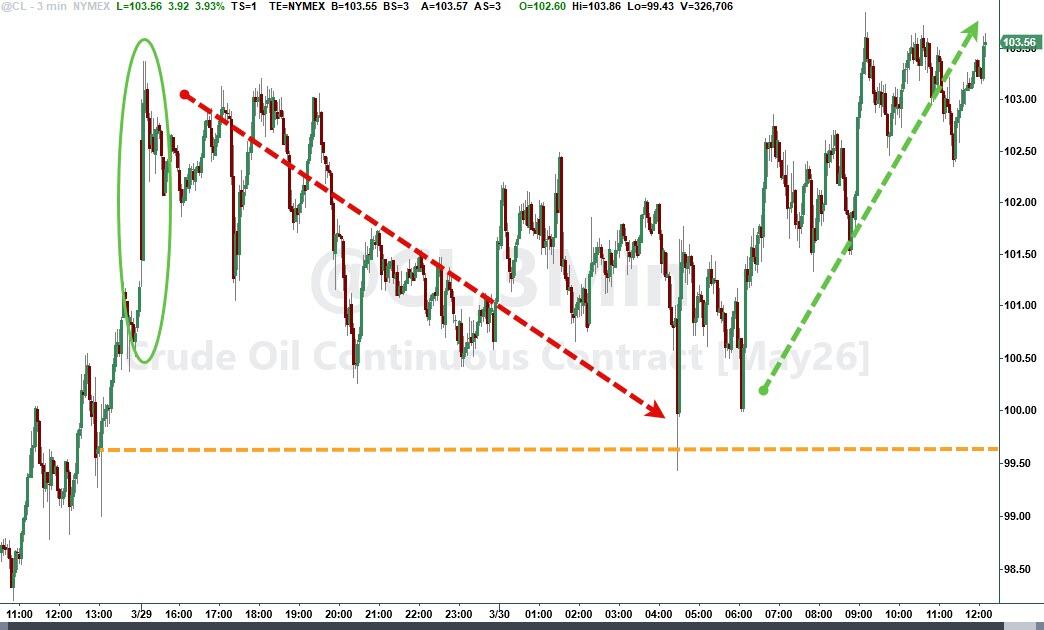 Sentiment flipped from bullish to bearish, and the indexes slid lower. In the end, only the Dow managed a tiny green close, while the S&P 500 and Nasdaq finished moderately in the red. Oil spiked and closed above $100, adding to the cautious tone.