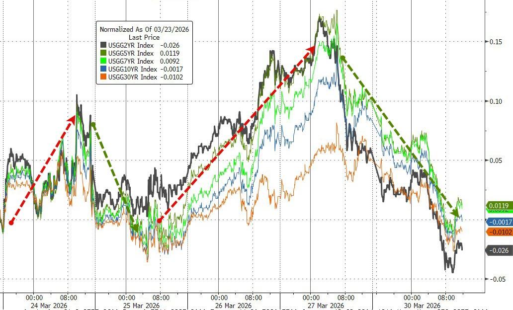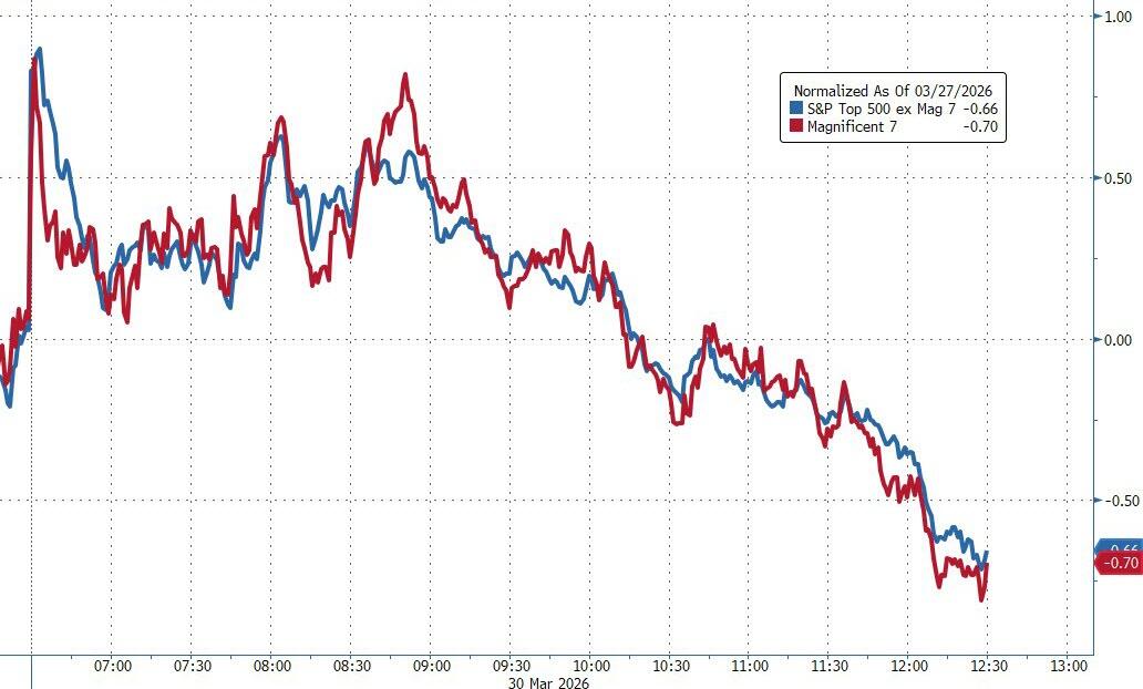 The Mag 7 and the broader S&P 493 tracked each other lower. Bond yields sank, the dollar rallied, gold rode a roller-coaster but ended roughly unchanged, silver and copper eked out small gains, and Bitcoin bounced around but closed basically flat.