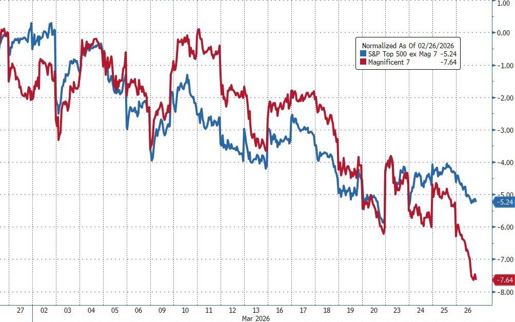 Gold broke below $4,400, and Bitcoin dropped from $72K to $68K. The Mag 7 continued to underperform the S&P 493 by a wide margin (now down 25% relative since the war began), with Microsoft off 24% YTD and Nvidia flat since July 2025.