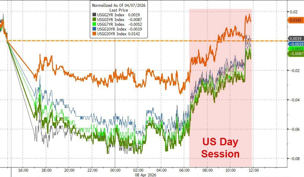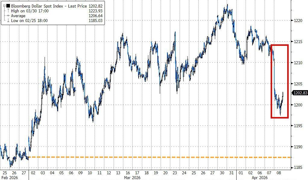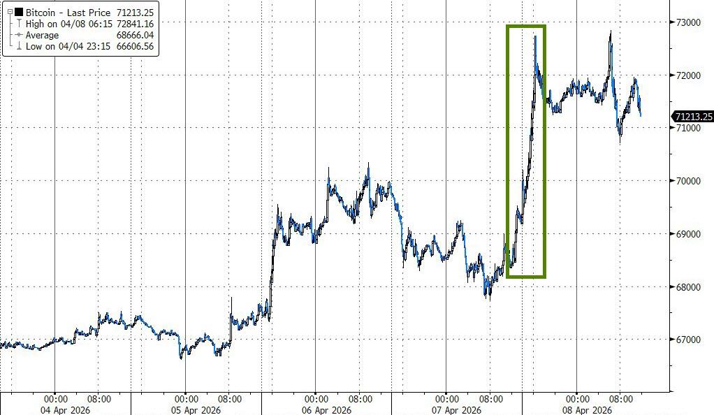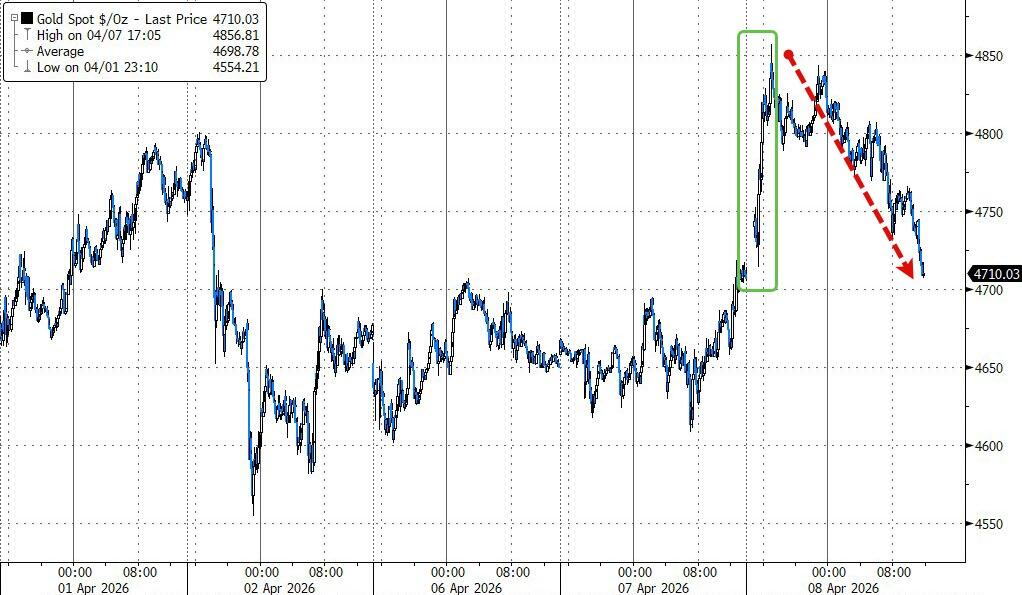 Bond yields ended unchanged, the dollar tumbled, gold surged back above $4,850 before slipping to $4,750 at the close, and Bitcoin gushed toward $73K before fading but still finished nicely higher than its pre-war levels around $65K.