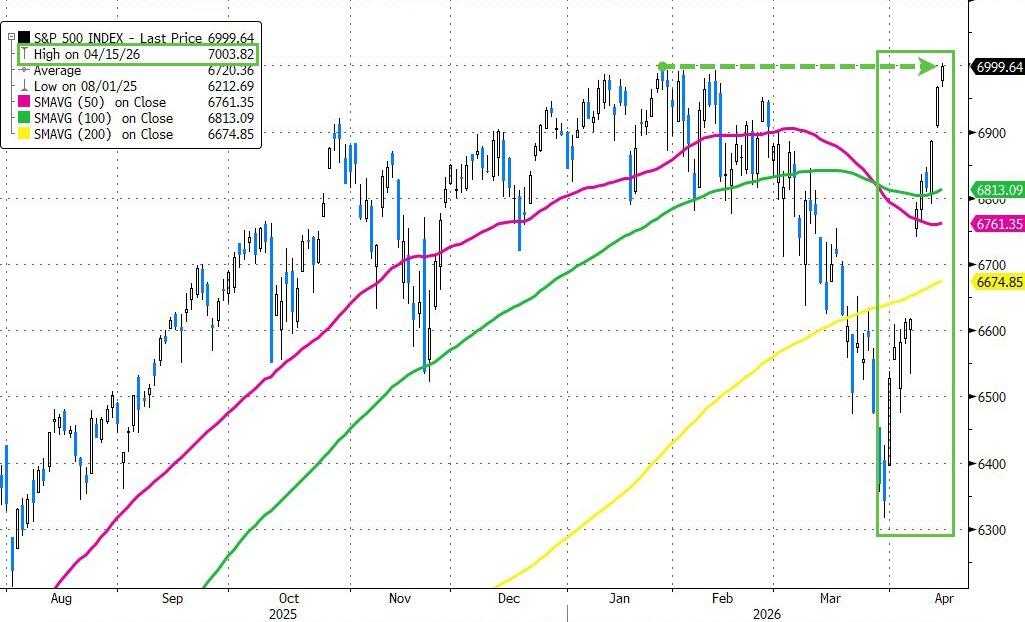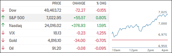 This followed a very strong prior session — the S&P 500 has now surpassed its previous all-time high of 7,002.28 from January 28, marking its ninth positive session out of the last ten.