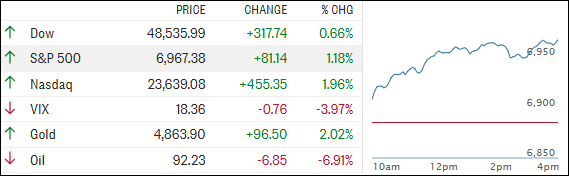 The Nasdaq led the way with the strongest gains, while tech stocks continued to support the broader market. Oracle jumped 7% (building on its big move the day before), and Nvidia and Palantir kept climbing too.