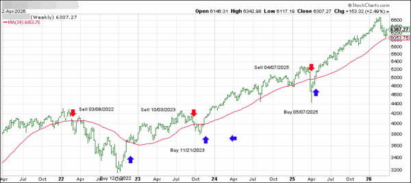 This is our global guide, the International Trend Tracking Index (green). It has broken above its long-term trend line (red) by +4.17% and has been in “Buy” mode since 5/7/2025.