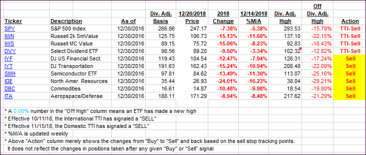 Again, the %M/A column above shows the position of the various ETFs in relation to their respective long-term trend lines, while the trailing sell stops are being tracked in the “Off High” column. The “Action” column will signal a “Sell” once the -8% point has been taken out in the “Off High” column. For more volatile sector ETFs, the trigger point is -10%.